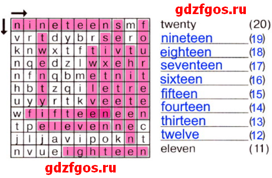 Найди и обведи в квадрате слова, обозначающие числа от 11 до 20 и запиши их по убыванию.