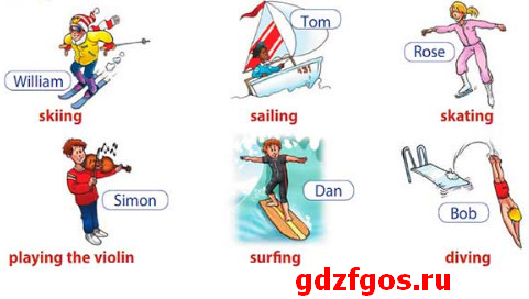William likes skiing. – [Уилльям – ски:ин:]Уильям любит кататься на лыжах.