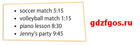 2 — b What time is the soccer match? — At quarter past five. – [Уот тайм из з’е сокэ: ма:тч? Эт куо:тэ: паст файв] – Когда матч по футболу? — В четверть шестого.