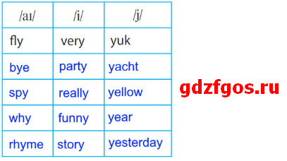 Read. Copy the table. Then put the words party, bye, yacht, spy, yellow, why, really, year, funny, rhyme, story, yesterday in the right column — Прочитай. Перерисуй таблицу в тетрадь и заполни её, вставив слова в нужную колонку.