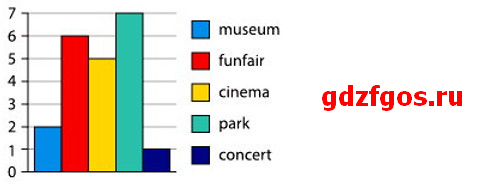 The chart shows where the children of Year 4 were at the weekend. Answer the questions. – На диаграмме показано, где были дети 4 класса на выходных. Ответь на вопросы.