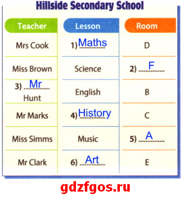 T: Good morning class. Welcome to Hillside Secondary School. Here are your teachers’ names and their classrooms. Write them in your notebooks, please. Let’s begin with Mrs Cook. Mrs Cook is your Maths teacher. She’s in room D. Write it down. Next is Miss Brown, she’s your Science teacher. She’s in room F. Your English teacher is Mr Hunt. Mr Hunt’s in room B. – Доброе утро класс. Добро пожаловать в Среднюю Школу Хиллсайд. Вот имена ваших преподавателей и их аудитории. Запишите их в своих тетрадях, пожалуйста. Начнем с Миссис Кук. Миссис Кук ваш преподаватель математики. Она в аудитории D. Запишите. Следующая – Мисс Браун, она ваш учитель по естествознанию. Она в аудитории F. Ваш учитель английского языка – Мистер Хант. Он в аудитории B.