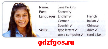 Jane can speak English, Spanish and Italian, but she can’t speak German, French or Chinese. She can type letters, drive a car, and use a computer, but she can’t send a fax.
