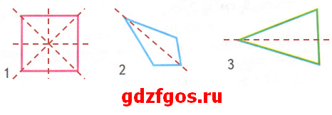 У фигуры 1 — 4 оси симметрии, у фигур 2 и 3 — 1 ось симметрии.
