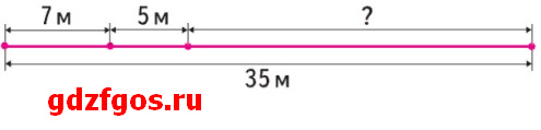Длина дорожки в саду 35 м. Миша расчистил от снега 7 м дорожки, Ира — 5 м, а остальную часть дорожки расчистил папа. Поставь вопрос и реши задачу, используя чертёж.