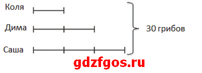 Так как Коля собрал меньше всех грибов, то примем собранные им грибы за 1 часть. Тогда Дима собрал 2 части, а Саша — 3 части.