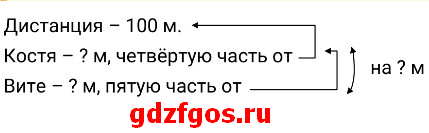 На юношеских соревнованиях по плаванию на 100 м Косте осталось проплыть четвёртую часть дистанции, а Вите — пятую её часть. Кто из них ближе к финишу и на сколько метров?