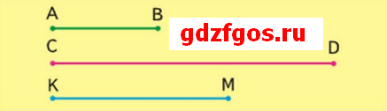Определи на глаз длину отрезков AB, CD, КМ. Для проверки измерь их длину в миллиметрах.