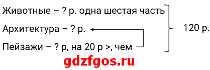 На выставке было 120 рисунков. Шестая часть их изображала животных, а остальные — памятники архитектуры и пейзажи. Пейзажей было на 20 больше, чем памятников архитектуры.