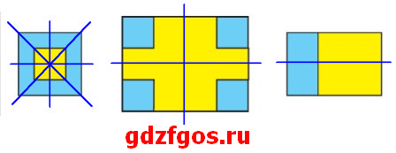 Начерти в тетради такие фигуры и найди площадь каждой части, закрашенной: 1) жёлтым цветом; 2) синим цветом. Можно ли каждую фигуру назвать симметричной?