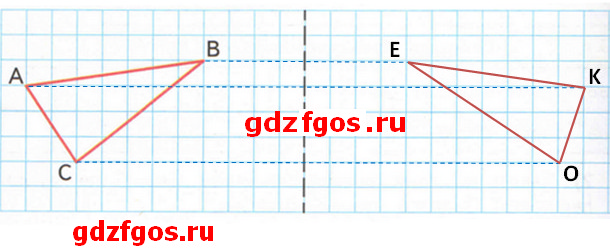 Начерти треугольник, симметричный треугольнику АВC относительно заданной оси симметрии. Обозначь его буквами КЕО. Будут ли равными площади этих треугольников?