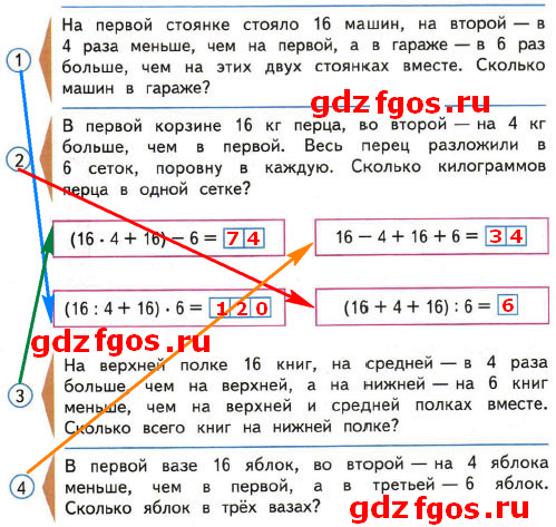 (4) В первой вазе 16 яблок, во второй — на 4 яблока меньше, чем в первой, а в третьей — 6 яблок. Сколько яблок в трёх вазах?