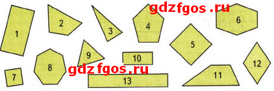 1) Выпиши номера всех четырёхугольников. Разбей все четырёхугольники на 2 группы. Подчеркни номера квадратов.