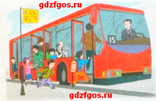 На остановку подъехал автобус №15. Несколько ребят бегут поскорее занять места. Один мальчик не торопится, он помогает пожилой женщине выйти из автобуса. Скоро автобус тронется, и все поедут по своим делам.