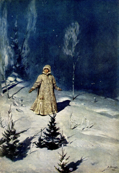 На картине В. М. Васнецова оживает настоящая зимняя сказка. Глубокая ночь окутала тёмный лес, а в высоком небе зажглись холодные алмазные звёзды. Из чащи на лесную поляну выходит дочь Мороза и Весны. Всё вокруг заливает таинственный лунный свет, придавая сугробам сияющий голубоватый цвет. Снегурочка одета в красивый наряд: на ней парчовая шубка жемчужно-серебристого цвета, шапочка с меховой опушкой и тёплые варежки.