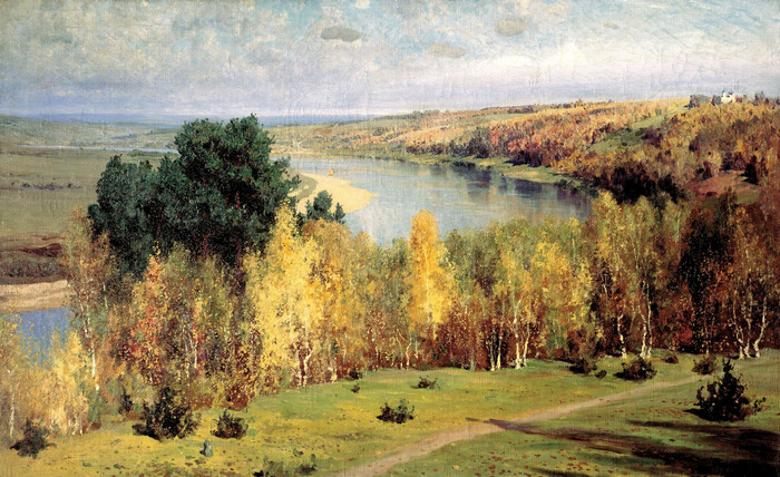 В светло-голубой реке отражаются жёлтая листва деревьев. Заливные луга, уходящие к горизонту, покрыты пока ещё зелёной травой или речным песком. Осенний наряд деревьев привлекает красивыми золотистыми оттенками пожелтевшей листвы. А земля отличается разнообразием зелёных и коричневых цветов, соответствующих тёплому «бабьему лету».