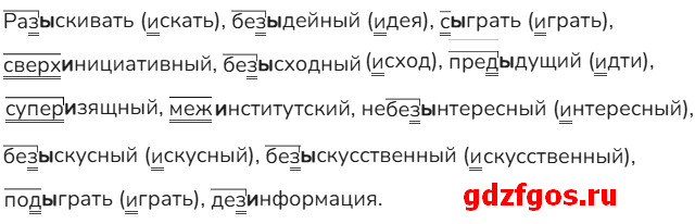 Разыскивать, безыдейный, сыграть, сверхинициативный, безысходный, предыдущий, суперизящный, межинститутский, небезынтересный, безыскусный, безыскусственный, подыграть, дезинформация.